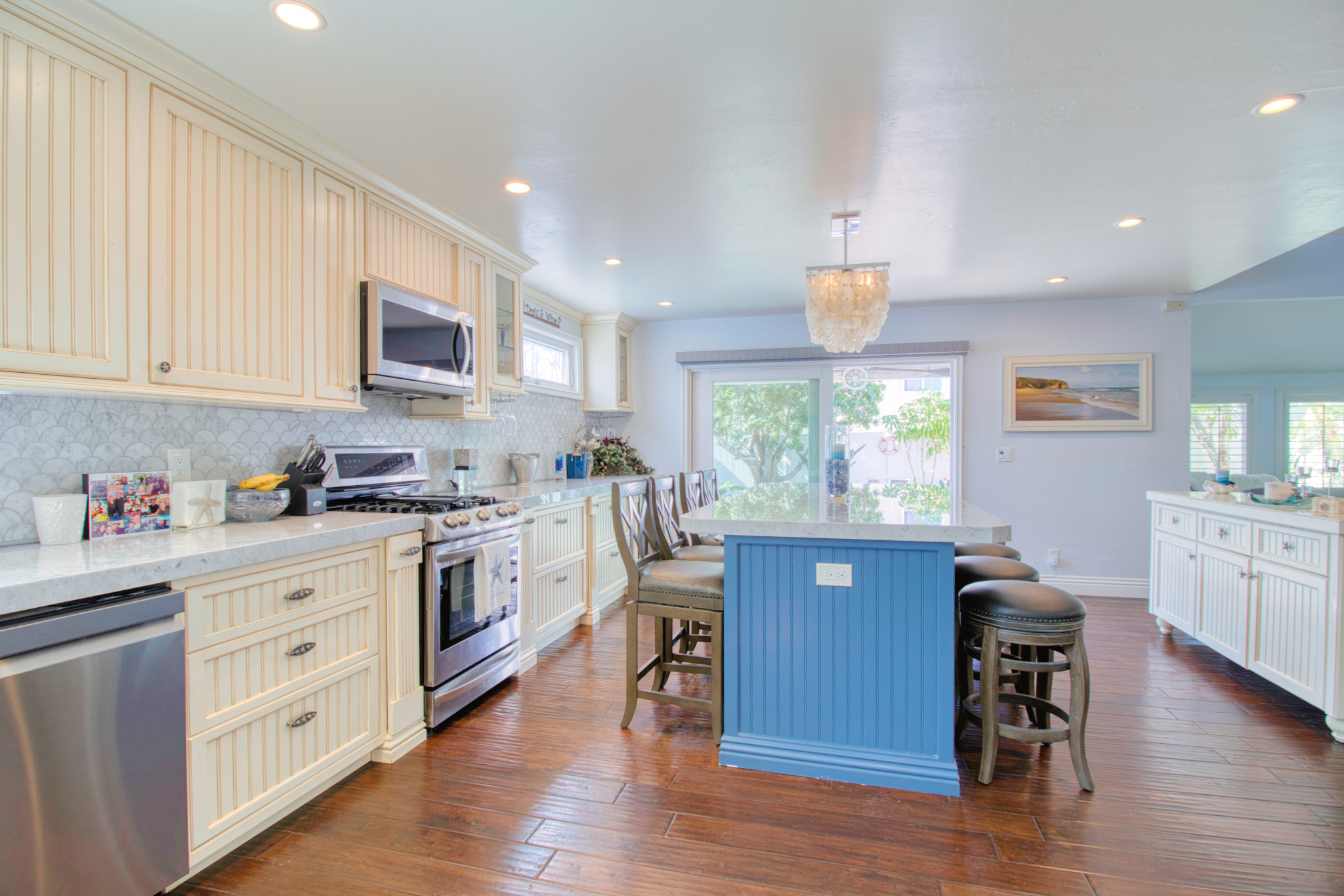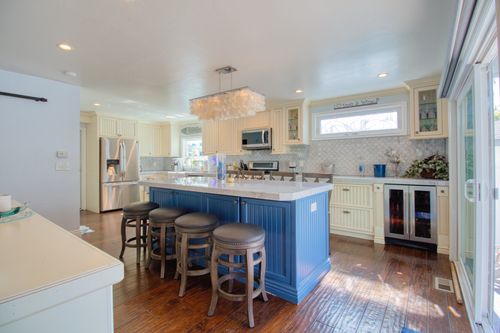 The kitchen was transformed into a spacious, light-filled centerpiece of the home. Custom cabinetry, a refined backsplash, upgraded appliances, and a large island finished in a bold accent color create both functionality and personality. High-end materials and clean craftsmanship deliver a polished look that feels timeless. The layout enhances workflow, while ambient lighting and coordinated design elements bring cohesion to the entire space.