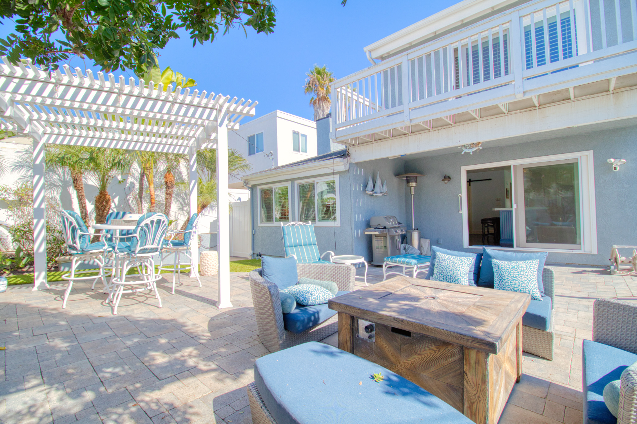 The backyard was redesigned to maximize enjoyment and relaxation. A pergola, coordinated outdoor furniture, grilling area, and updated hardscaping create a bright, resort-style outdoor lounge. The layout encourages hosting, dining, and leisure—turning the backyard into a true extension of the home.