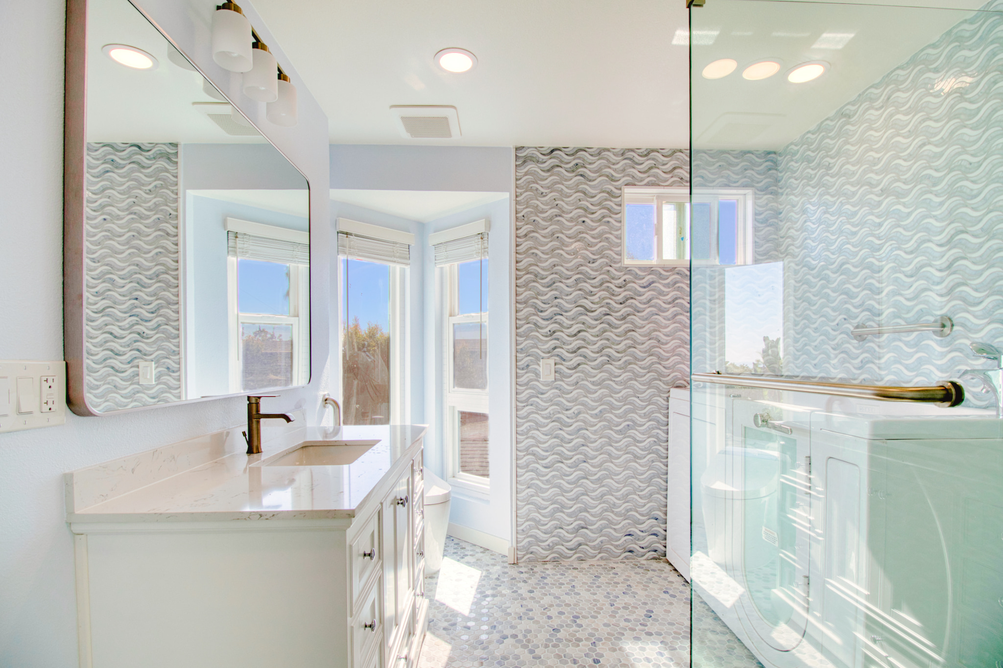 The bathroom remodel focused on comfort and accessibility without sacrificing style. A walk-in bathing unit, modern glass shower enclosure, textured tile walls, and natural-light windows create a refreshing, spa-like environment. Durable materials and thoughtful design choices ensure both practicality and elegance.